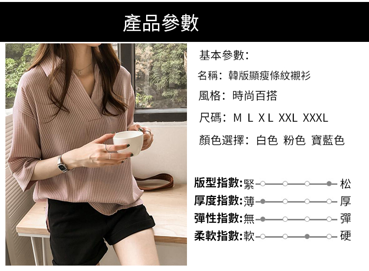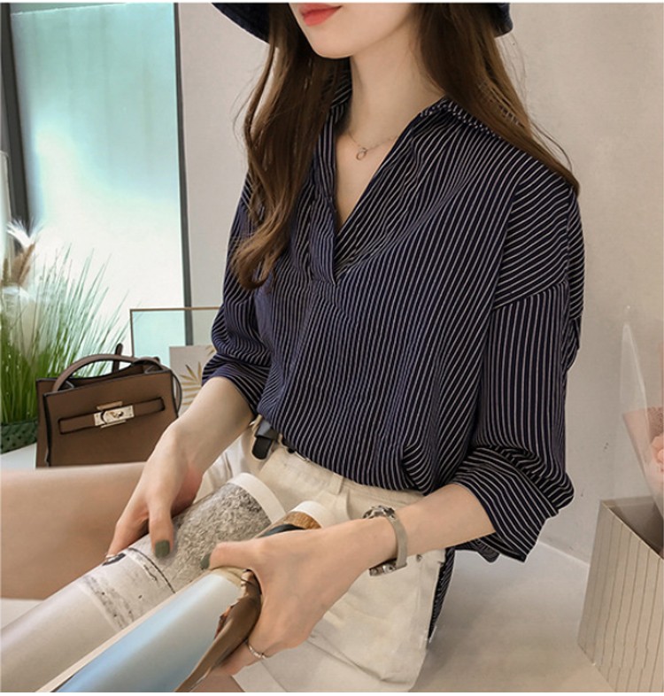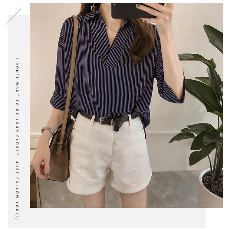 新款韓版寬松顯瘦七分袖條紋襯衫